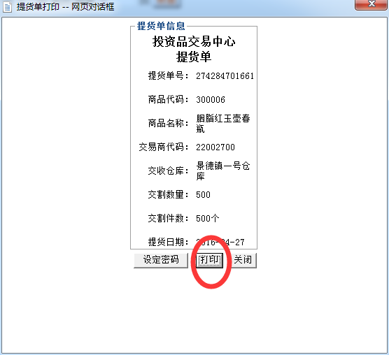 綜合業(yè)務(wù)---發(fā)售業(yè)務(wù)---交收提貨---自提打印,設(shè)定提貨密碼、打印;