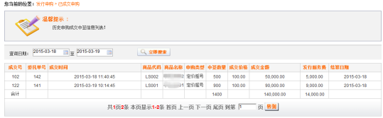 通過該頁面可以查詢到商品已申購成交的情況,包括對應(yīng)商品中簽的數(shù)量、成交價(jià)格、申購類型、成交金額、發(fā)行服務(wù)費(fèi)等信息。