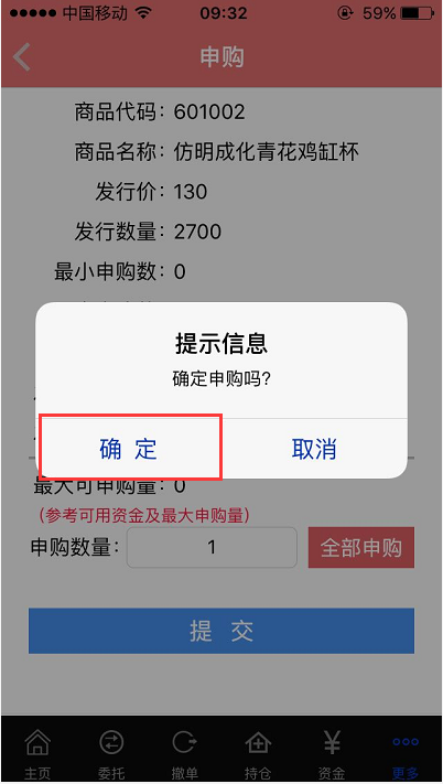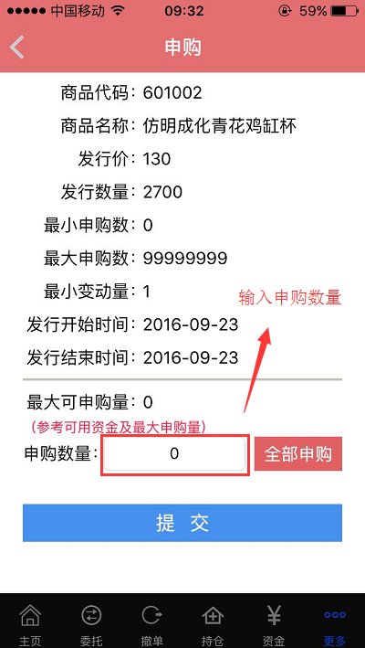 第七步:輸入“申購數量”并點擊提交,如圖1-7