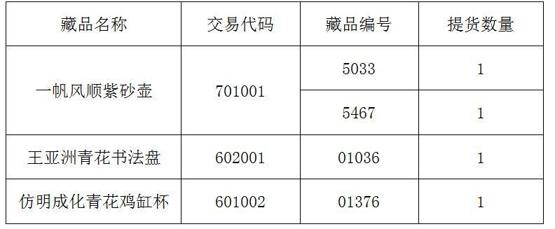 應投資人會員申請,經本交易所對申請人信息核實以及出庫藏品復驗后,提貨藏品已完成發(fā)貨,提醒廣大投資者注意盤面藏品數量變化。提貨藏品信息如下: