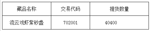 應(yīng)發(fā)行會員以全流通模式申請,本交易所對申請人信息核實(shí)以及出庫藏品復(fù)驗(yàn)后,提貨藏品已完成發(fā)貨,提醒廣大投資者注意盤面藏品數(shù)量變化。提貨藏品信息如下: